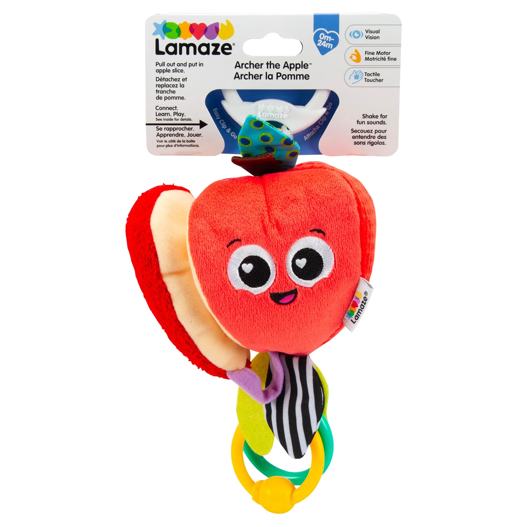Le jouet pour bébé Lamaze Archer the Apple Clip & Go est une grande friandise rouge. Tirez sur la tranche de pomme attachée pour trouver le petit ami d'Archer et voir à l'intérieur d'une pomme. Ce jouet pour bébé coloré peut aider à démarrer des conversations précoces sur une alimentation saine.