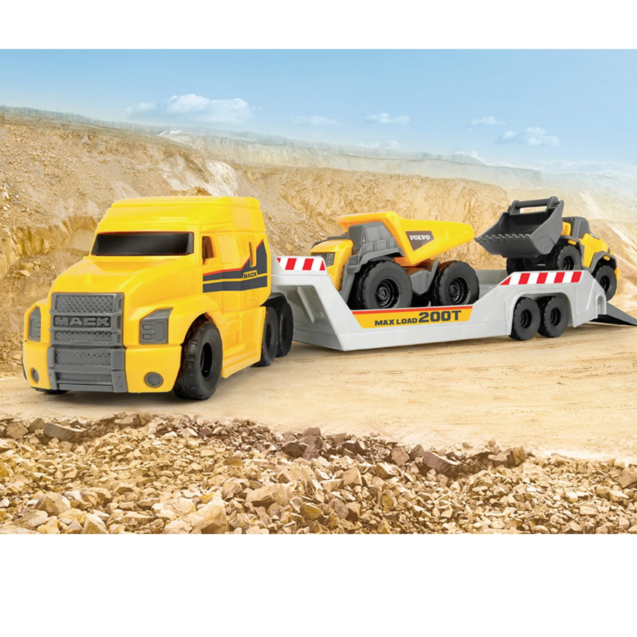 Inclut : remorque de camion Mack, 2 véhicules Volvo (camion de mine et chargeuse)