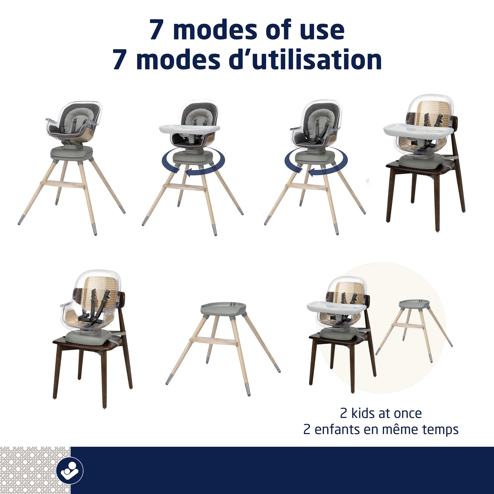Conçue pour grandir avec votre enfant, la chaise haute tournante Ă 360° Kiskadee de Maxi-Cosi offre 7 modes polyvalents: chaise haute inclinable pour bĂ©bĂ©, siĂšge dâappoint pour tout-petits, tabouret pour enfants et configuration pour deux enfants. En mode chaise haute, le siĂšge rotatif Ă 360° pivote sans effort Ă intervalles de 90°, ce qui facilite le placement et le retrait de votre enfant de la chaise, tout en garantissant des repas et interactions faciles.  Les 3 inclinaisons permettent de personnaliser le confort des bĂ©bĂ©s. .