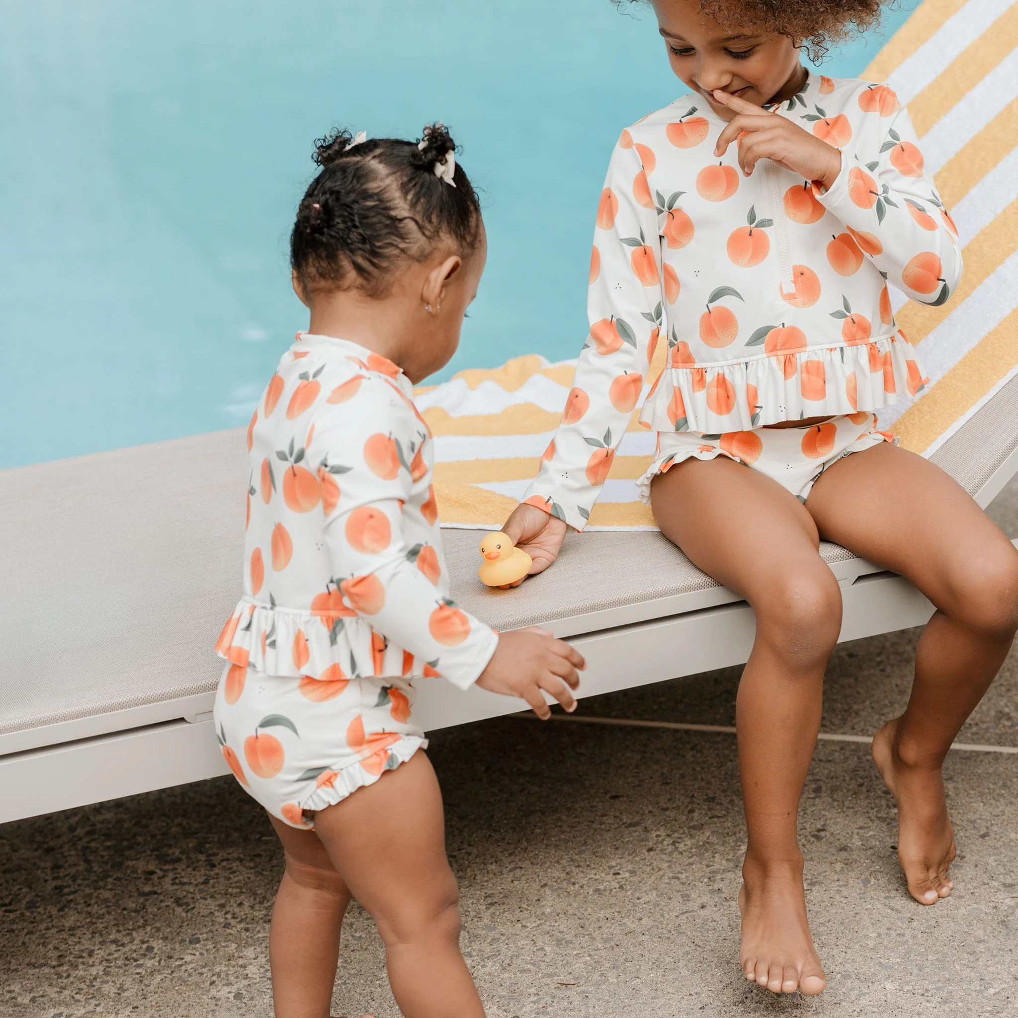 Préparez-la pour de douces aventures estivales avec cet adorable maillot de bain 2 pièces à imprimé de pêches. Conçu pour les journées ensoleillées au bord de l'eau, ce maillot à manches longues lui permet de rester couverte tout en s'amusant et la demi-fermeture éclair sur le devant permet de l'enfiler et de l'enlever facilement. Le bas de maillot de bain coordonné a une bordure froufroutante et la garde à l'aise pendant qu'elle s'amuse et éclabousse. Léger, séchant rapidement et doté d'une protection UPF 50+ intégrée, il lui permet de passer de la piscine au pique-nique et vice-versa.