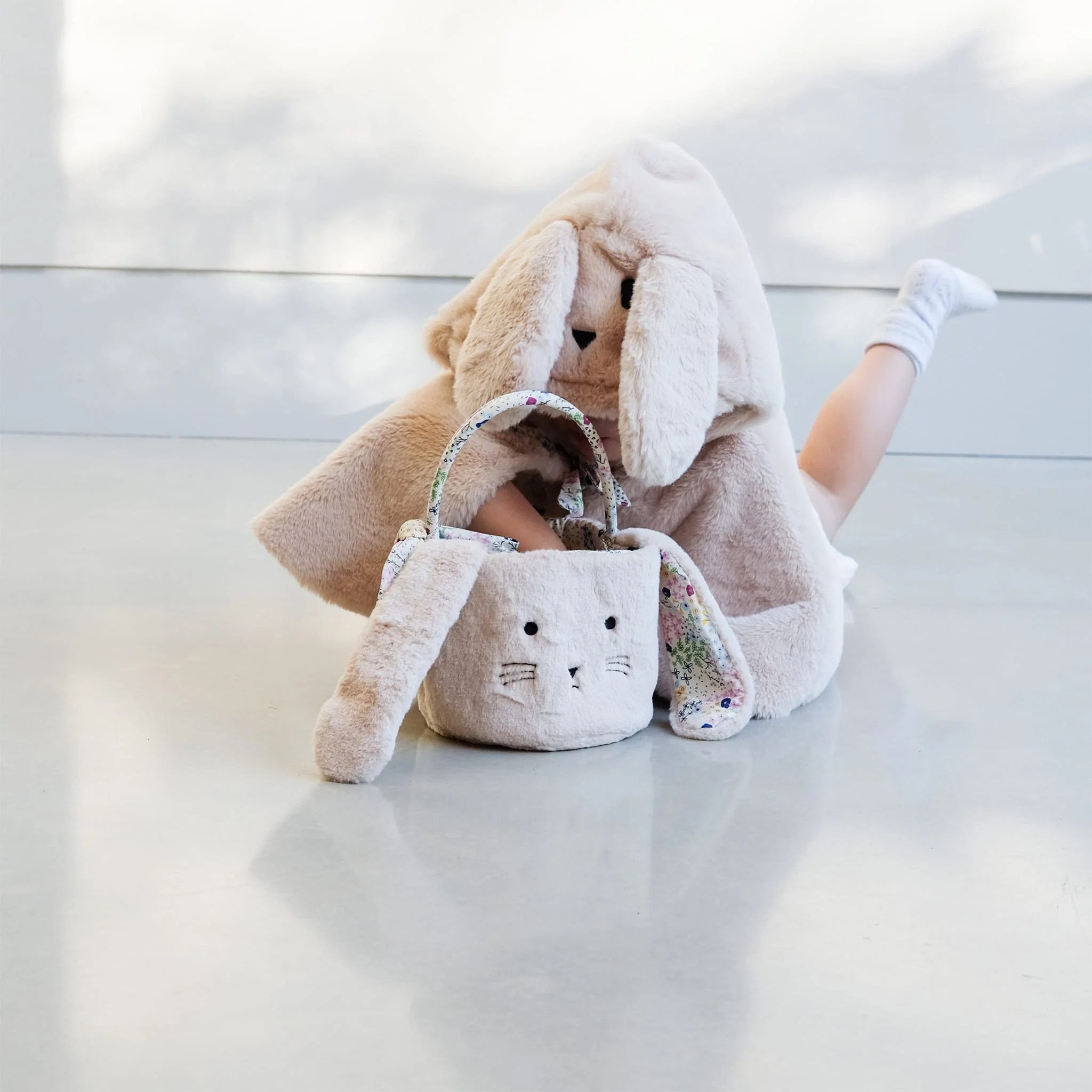 -Confectionné dans la plus douce des fourrures avec une doublure fleurie doté de longues oreilles d’une anse de transport et d’un nœud noué à la main avec un adorable visage de lapin brodé et une queue en pompon