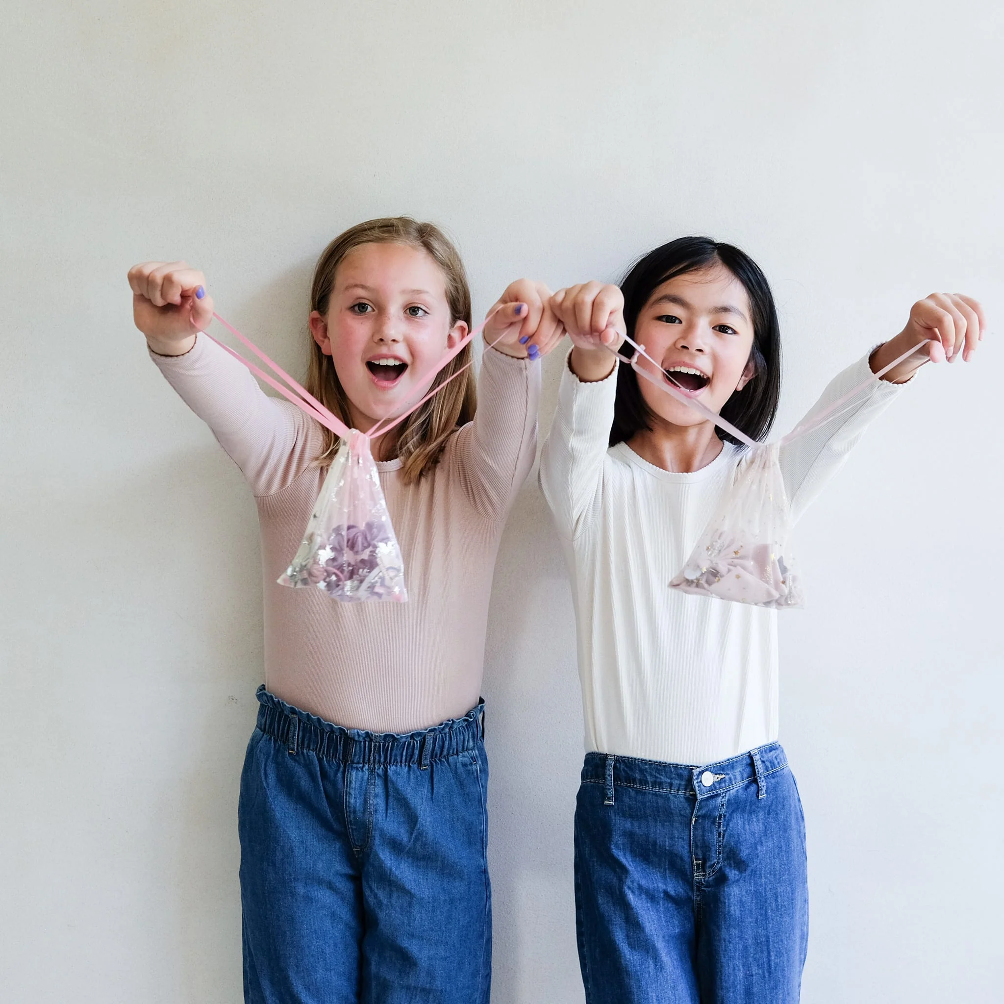 Notre toute nouvelle pochette « Unicorn Sparkle » est l’idée cadeau la plus magique, prête à offrir ! À l’intérieur de la pochette en tulle arc-en-ciel imprimée d’un licorne argentée se cache une magnifique sélection d’accessoires licorne dans les tons rose et violet : des ponies et des barrettes qui feront briller toutes les coiffures.